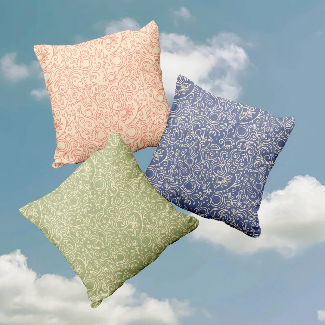 My work is rooted in illustration-led, 100% human-made visuals designed to translate seamlessly across surfaces like fabric, packaging, paper goods, and home decor. I’m especially drawn to creating pieces that feel whimsical, organic, and magical!