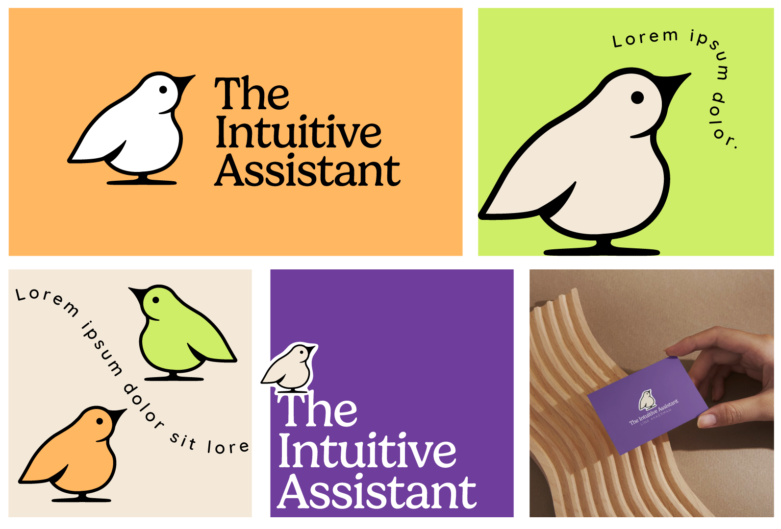 We kicked things off with a series of concept sketches to explore possible directions, weighing the strengths and weaknesses of each approach. Ultimately, we landed on a stylized bird emblem, a mark that balances softness with strength. Its rounded, comforting body embodies the nurturing, compassionate qualities at the heart of The Intuitive Assistant, while its defined beak and grounded stance signal clarity, focus, and dependability.